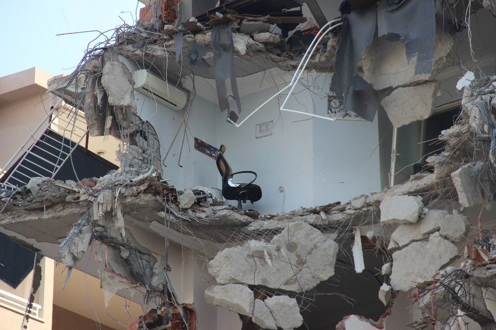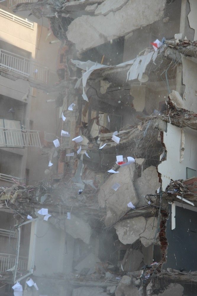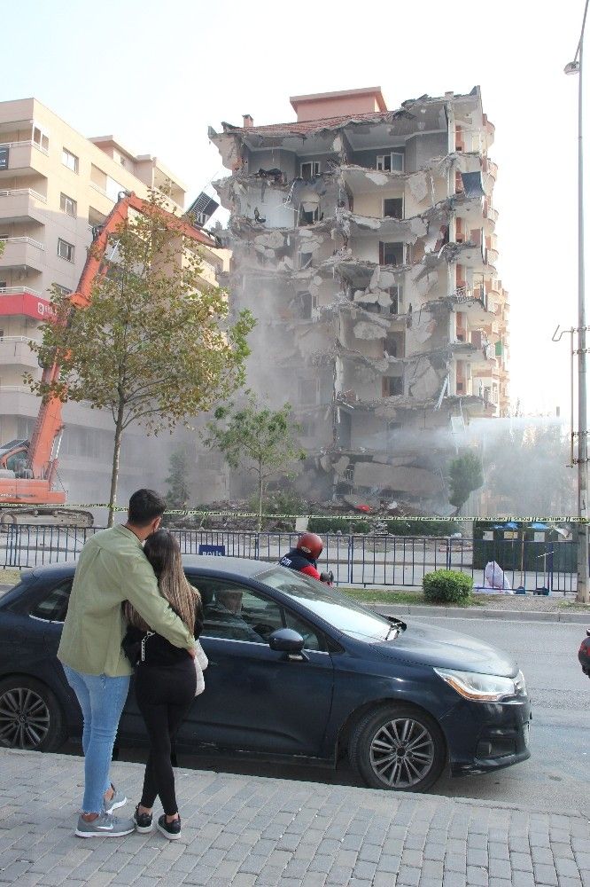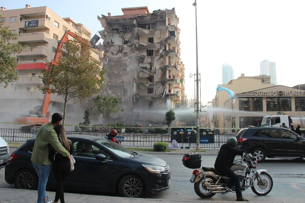 İzmir'deki depremde çok sayıda bina hasar gördü. Hasarlı binaların kontrollü şekilde yıkım işlemleri de devam ediyor. İzmir Bayraklı'daki Haydar Aliyev Caddesi üzerinde bulunan Canbazoğlu Sitesi, iş makineleri ile yıkılıyor. Çok sayıda kişinin hayatını kaybettiği Rıza Bey Apartmanı'nın yakınında bulunan sitenin yıkımına, vatandaşların ilgisi de büyük oldu. Bir çift, sarılarak adeta film izler gibi yıkımı izlerken, bir araç sürücüsü ise seyir halindeyken cep telefonuna sarılıp yıkımı kaydetmeye çalıştı. Bir vatandaşın ise elinde alışveriş poşetleri varken yıkımı cep telefonu kamerasına kaydettiği görüldü. Öte yandan binada birçok hukuk bürosunun olması sebebiyle yıkım sırasında dava dosyalarının savrulması dikkat çekti.