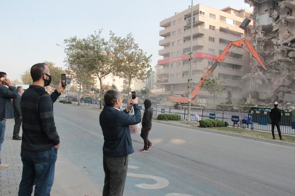 Yıkımı kaydeden Mehmet Bişeroğlu isimli vatandaş, "Çekmek istedim, çekiyorum. Ağabeyim Rıza Bey Apartmanı'nda oturuyordu. Kızım Dilek de o sırada binadaydı. Birden bire her yer toz olunca 'Rıza Bey Apartmanı gitti' dediler. Hemen oraya koştum. Kızımı 45 dakika sonra enkazdan çıkarttık" dedi. Ramazan Çiftçi ise, "2000 yılında buradan ev alacaktım ama nasip olmadı. Demek ki kısmet bu şekildeymiş. 20 yıl önce almak için baktığım binalar şimdi hasarlı. Buradan ev almadım diye seviniyorum. Eğer alsaydım ben de mi bunları yaşayacaktım diye düşünüyorum. Evleri hasarlı olan insanlar için de üzülüyorum" diye konuştu. Yıkımı çekenler arasında Giresun'dan İzmir'e gelen gazetecilik bölümü öğrencileri de vardı. Şefik Durdu ve Cansu Tatar, "Giresun Üniversitesi Gazetecilik Bölümü öğrencileriyiz. Yaşanılanları görmek, vatandaşlardan bilgi toplamak ve haber yapmak için buradayız" ifadelerini kullandı.