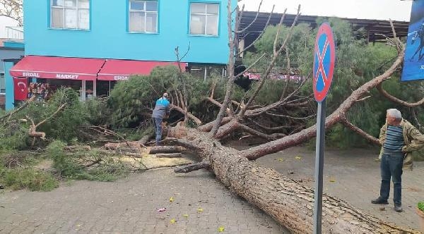 Fırtınada çam ağacı otomobilin üzerine devrildi