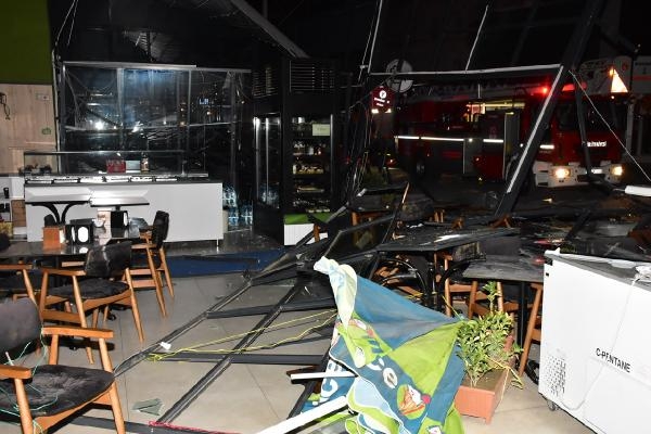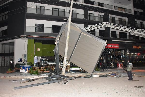 Fırtınada uçan tente elektrik direğine zarar verdi