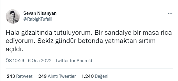 Nişanyan'ın Yunan vatandaşı ile evli olması nedeniyle aldığı oturumun 29 Aralık'ta yenilenmediğini belirten İra Tzourou, "Yunanistan makamları, Sevan Nişanyanı 30 Aralık günü kibar bir hile ile karakola kendi arzusu ile götürüp, 1 saat beklettikten sonra oturumunun bir gün önce bitmesi nedeni ile tutukladı" dedi.