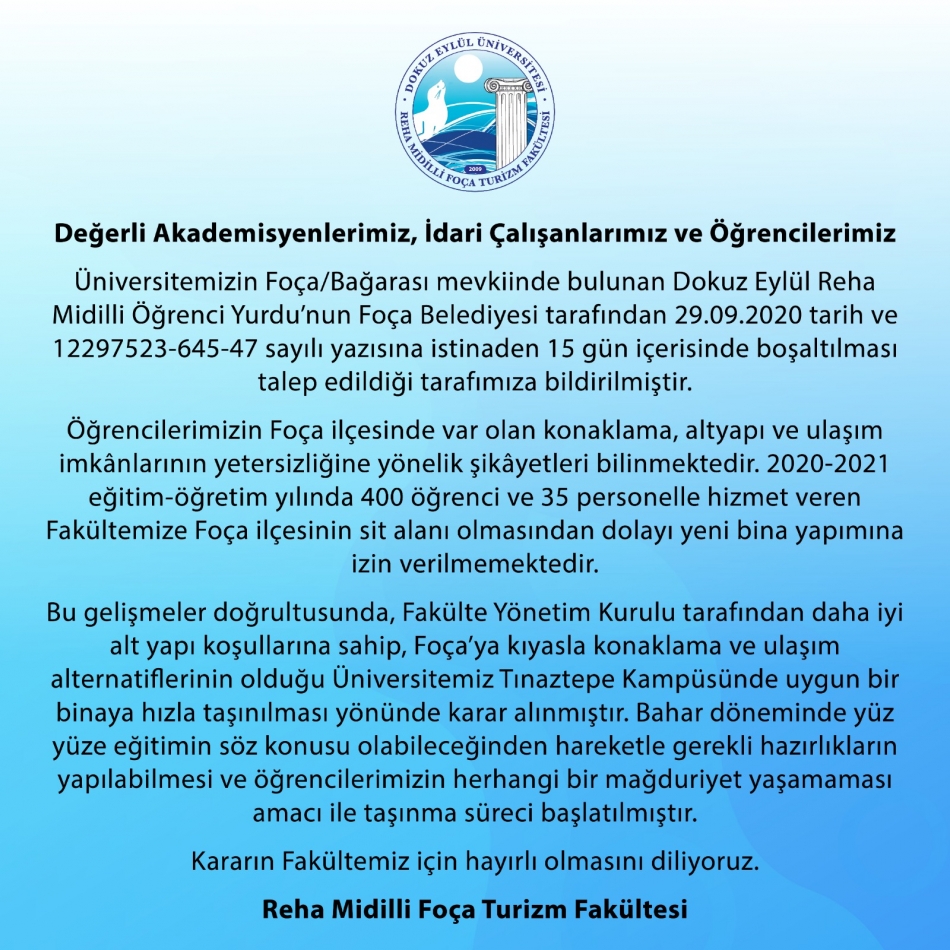 İzmir’in Foça ilçesinde bulunan Dokuz Eylül Üniversitesi Reha Midilli Foça Turizm Fakültesi'nin Buca Tınaztepe Kampüsü'ne taşınması kararı alındı. Taşınma kararına ilçedeki yurt sorunu, konaklama, altyapı ve ulaşım imkanlarının yetersizliği gerekçe gösterildi.