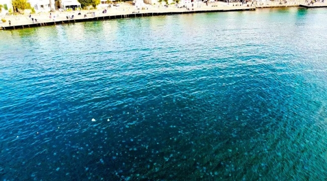 İzmir'in önemli turizm ilçelerinden biri olan Foça'da yaz aylarında başlayan denizanası istilası devam ediyor. Kentte son günlerde etkili olan yağış nedeniyle denizanaları Foça kıyılarına adeta akın etti. Binlerce denizanası havadan böyle görüntülendi.