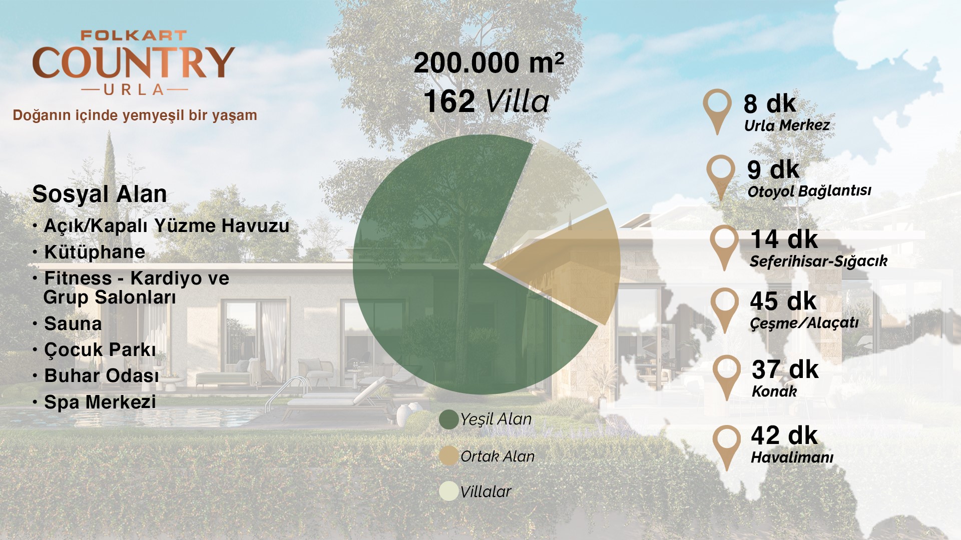 Tarihi ve doğal güzellikleriyle olduğu kadar, bölgeye has iklimiyle de 4 mevsimin doyasıya yaşanabilecek Urla’da, Ege’nin eşsiz lezzetlerin tadılabileceği gastronomi lokasyonlarına da çok yakın konumda yer alıyor. Proje, batısında Çeşme, kuzeyinde Güzelbahçe, güneyinde ise Seferihisar’a komşu konumda bulunuyor. Folkart yeni projesinde, ısıtmanın doğalgaz ile sağlandığı, kış bahçelerinin bulunduğu villalarda, doğal, konforlu ve sakin bir yaşam sunmayı hedefliyor. Folkart Country Urla’da 2+1 Tek Katlı, 3+1 Tek Katlı, 3+1 Dubleks, 3+1 Dubleks-2, 4+1 Tek Katlı, 4+1 Dubleks tipinde villalar bulunuyor. Projede her bir villa için havuz seçeneğini isteğe bağlı bir seçenek olarak sunuluyor.