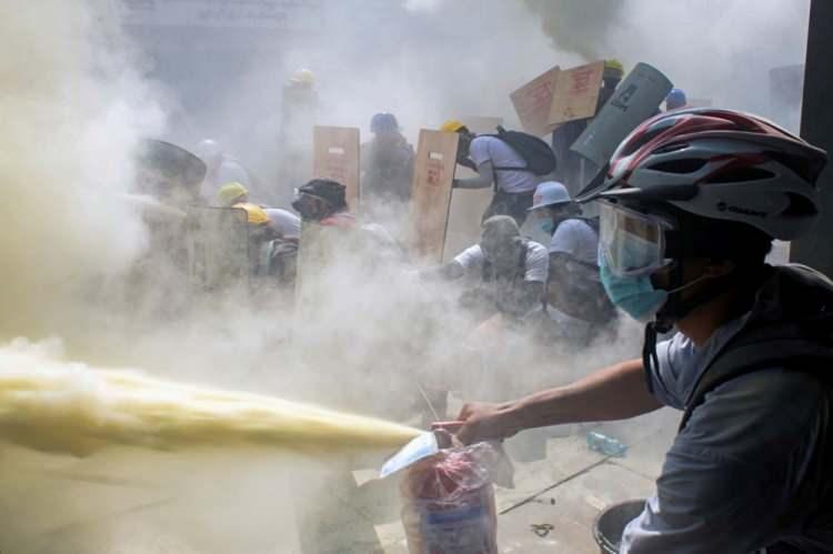 28 Şubat'ta Myanmar'ın Yangon kentindeki askeri darbeye karşı düzenlenen bir protesto sırasında göstericiler çevik kuvvet polisleriyle çatışırken bir protestocu yangın söndürücü püskürtüyor.