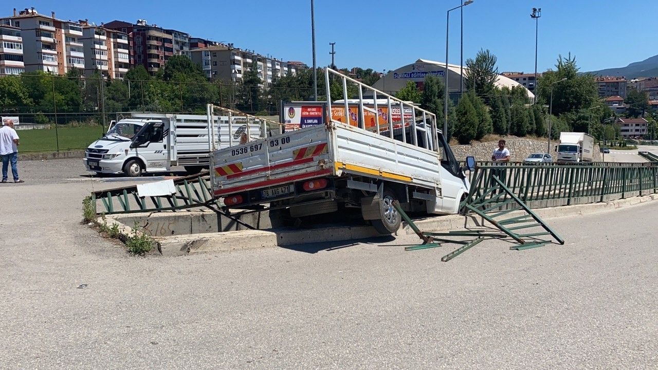 Karabük'te park halindeki kamyonet, el freninin boşalmasının ardından rampa aşağıya hareket edip korkuluklarına çarptığı su kanalında asılı kaldı.