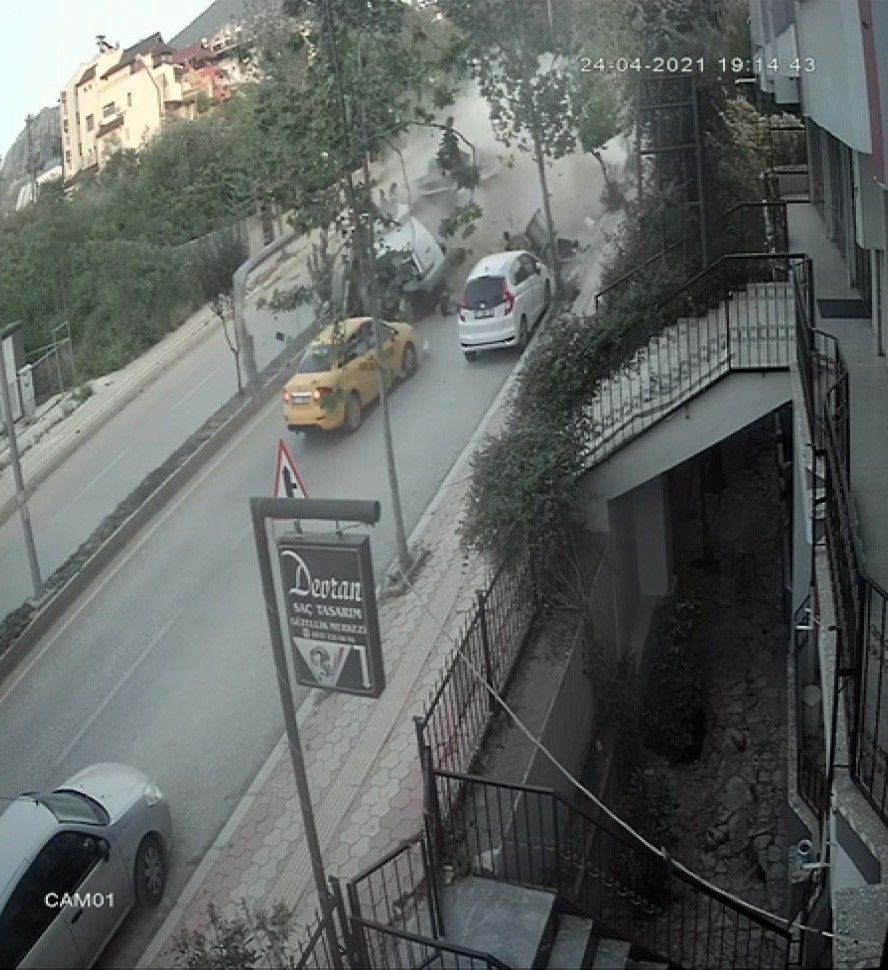Hatay'da freni boşalan vincin 11 araca çarptığı, 4 kişinin hayatını kaybettiği, 4 kişinin de yaralandığı kaza anı güvenlik kamerasına yansıdı.