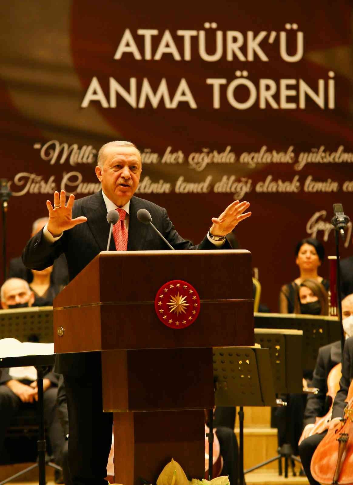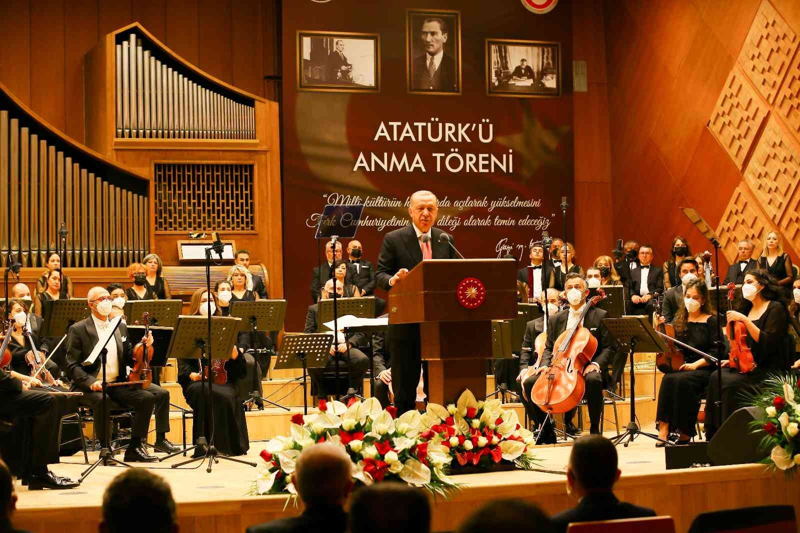 Cumhurbaşkanı Recep Tayyip Erdoğan, Gazi Mustafa Kemal Atatürk'ün ebediyete irtihalinin 83. yıl dönümünde Atatürk, Kültür, Dil ve Tarih Yüksek Kurumu tarafından düzenlenen anma törenine katıldı. Tarihi Cumhurbaşkanlığı Senfoni Orkestrası (CSO) Konser Salonu'nda düzenlenen törende konuşan Cumhurbaşkanı Erdoğan, "İstiklal mücadelemizin başkomutanı, Cumhuriyetimizin banisi Gazi Mustafa Kemal Atatürk'ü ebediyete irtihalinin 83'üncü yıl dönümünde hürmet ve rahmetle yad ediyorum. Malazgirt Zaferi'nden beri bu toprakların vatanımız olması için mücadele eden, gözlerini kırpmadan canlarını veren tüm şehitlerimize, gazilerimize ve kahramanlarımıza Allah'tan rahmet diliyorum. Kurucu kadro başta olmak üzere Türkiye Büyük Millet Meclisinin toplandığı ilk günden bugüne kadar Cumhuriyetimizin ayakta kalması, gelişmesi, büyümesi için gayret gösteren herkese şükranlarımı sunuyorum. Hala sınır boylarımızda vatan nöbeti bekleyen askerimizden ekmek teknesi başında ter döken esnaf ve işçimize, toprağı eken çiftçimize, fabrikasında üretim yapan girişimcimize, kamuda görev yapan insanımıza kadar büyük ve güçlü Türkiye'nin inşası için çalışan herkese müteşekkiriz. Amacımız Cumhuriyetimizi kuruluşunun 100'üncü yılında ülkemizi, ecdadımızın mirasına layık ve milletimizin hayallerine uygun bir seviyeye çıkarmaktır. Bunun için eğitimden sağlığa, güvenlikten teknolojiye kadar her alanda kurduğumuz sağlam altyapı üzerinde siyasi ve ekonomik gücü ile dünyanın birinci liginde iddia sahibi bir Türkiye inşa etmenin gayreti içindeyiz" ifadelerini kullandı.