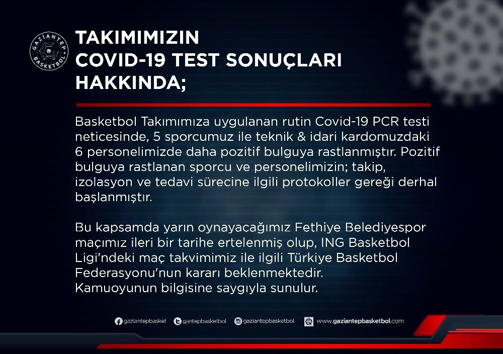 Kulüpten yapılan yazılı açıklamada "Basketbol Takımımıza uygulanan rutin Kovid-19 PCR testi neticesinde, 5 sporcumuz ile teknik ve idari kadromuzdaki 6 personelimizde daha pozitif bulguya rastlanmıştır. Pozitif bulguya rastlanan sporcu ve personelimizin; takip, izolasyon ve tedavi sürecine ilgili protokoller gereği derhal başlanmıştır. Bu kapsamda yarın oynayacağımız Fethiye Belediyespor maçımız ileri bir tarihe ertelenmiş olup, ING Basketbol Ligi'ndeki maç takvimimiz ile ilgili Türkiye Basketbol Federasyonu'nun kararı beklenmektedir" ifadeleri kullanıldı.