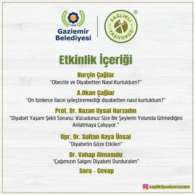 Sağlıklı Yaşıyoruz kurucuları Nurçin Çağlar ve A. Okan Çağlar’ın moderatörlüğünde düzenlenecek toplantı, Diyabet ve Obezite ile Mücadele başlığıyla düzenlenecek. Sağlıklı Yaşıyoruz doktorlarının, obezite ve diyabetin kök sebeplerinin yanı sıra diğer kronik hastalıklarla ilişkisinin de masaya yatıracağı toplantıda bu hastalıklardan korunma ve tedavi yöntemleri hakkında önemli bilgiler paylaşılacak. Toplantıda, Prof. Dr. Nazan Uysal Harzadın, “Diyabet Yaşam Şekli Sorunu: Vücudunuz Size Bir Şeylerin Yolunda Gitmediğini Anlatmaya Çalışıyor,” Opr. Dr. Sultan Kaya Ünsal, “Diyabetin Göze Etkileri” ve Dr. Vahap Almasulu “Çağımızın Salgını Diyabeti Durduralım” başlıklarında sunum yapacak. Nurçin Çağlar ile Okan Çağlar, diyabet ve obeziteden nasıl kurtulduklarını, bu süreçte yaşadıkları deneyimleri dinleyicilere anlatacak.