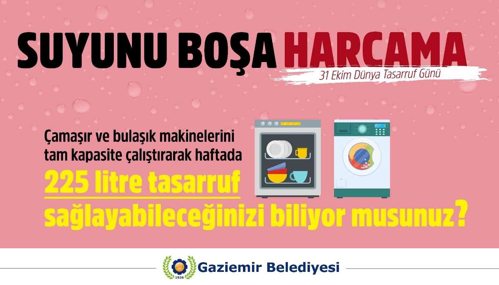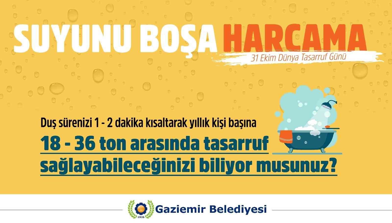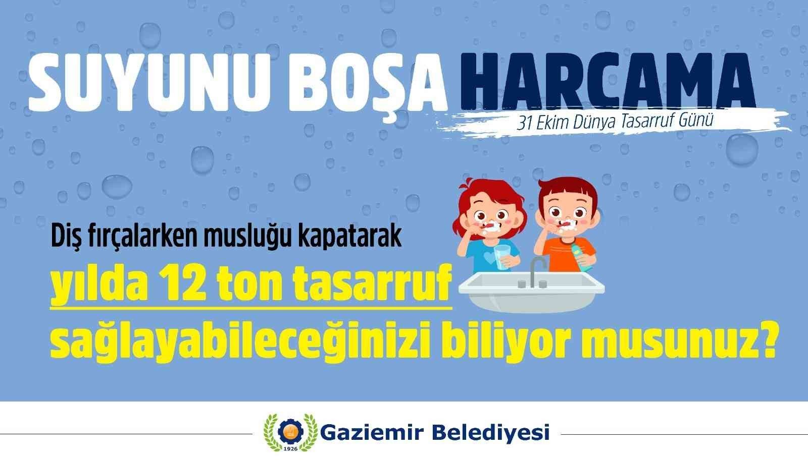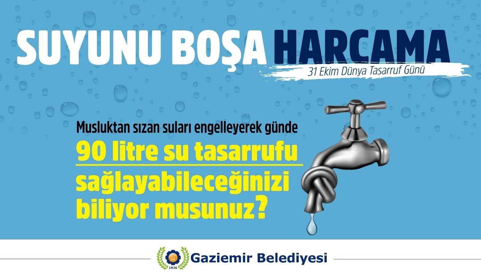 Gaziemir Belediyesi, 31 Ekim Dünya Tasarruf Günü'nde hazırladığı görsel çalışmalarla su tasarrufuna dikkat çekti. Belediye, yaptığı farkındalık kampanyasıyla "Suyunu boşa harcama" mesajı verdi..