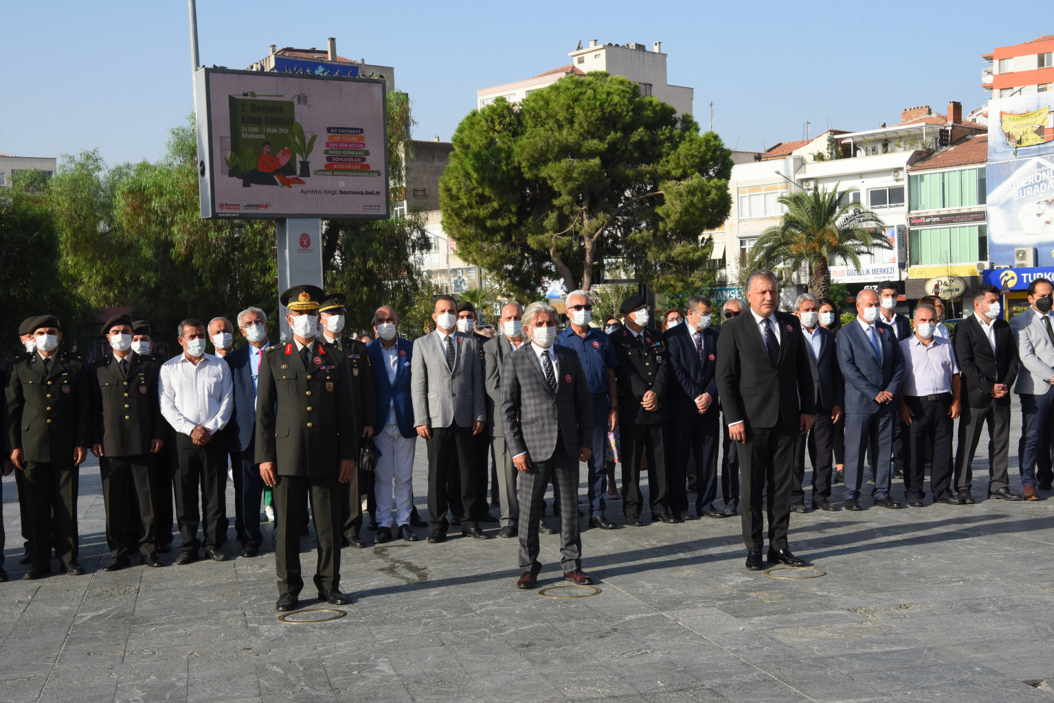İzmir Bornova Cumhuriyet Meydanı’nda düzenlenen resmi törende Bornova Kaymakamı Fatih Genel, 57. Topçu Tugayı Komutan Tuğgeneral Halil Ünver, Bornova Belediye Başkan Yardımcısı Barbaros Taşer ve Türkiye Muharip Gaziler Derneği İzmir Şubesi Yönetim Kurulu Üyesi Sami Atik Atatürk Anıtı’na çelenk koydu.