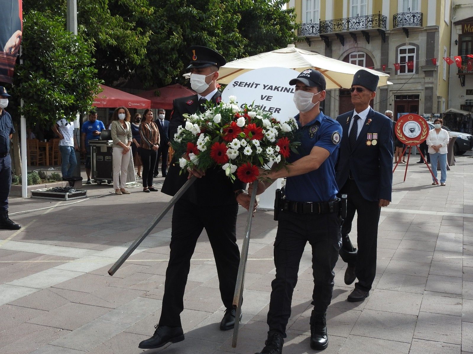 Çeşme Cumhuriyet Meydanı'nda düzenlenen törene, Çeşme Kaymakamı Ünal Çakıcı, Çeşme Belediye Başkanı Ekrem Oran, Cumhuriyet Başsavcısı Burak Kocaoğlu, Garnizon Komutan Vekili Aziz Yıldız, İlçe Emniyet Müdürü Gürcan Alev, İlçe Jandarma Komutanı Yüzbaşı Erkan Kip, Sahil Güvenlik Komutanı Üsteğmen Orkun Artar, gaziler, Kamu kurum ve kuruluş temsilcileri, siyasi parti, sivil toplum kuruluşları ve mesleki kuruluş temsilcileri ve vatandaşlar katıldı.