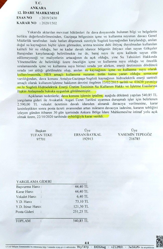 Davacı tarafın Antalya Büyükşehir Belediyesi Antalya Su ve Atıksu İdaresi (ASAT) Genel Müdürlüğü olduğu dosya, Ankara 12. İdare Mahkemesi tarafından görüldü ve karara bağlandı. Mahkeme Sugözü kaynağının Hidroelektrik Enerji Santrali (HES) amacıyla işletilmesi için GÜÇBİR A.Ş. ile DSİ arasındaki anlaşmanın ve Enerji Piyasası Kurulunca verilen ön lisansın iptaline hükmetti.