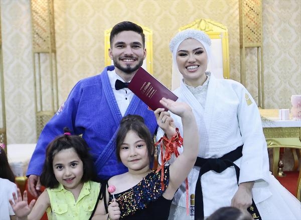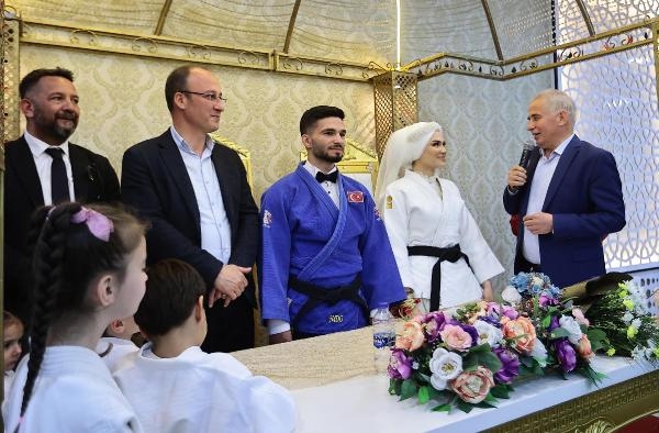 DENİZLİ'de her ikisi de judo antrenörü olan Talha Enes Arıoğlu (23) ile Ümran Şahbal'ın (23) nikah töreni renkli görüntülere sahne oldu. Gelin Ümran Şahbal, nikah öncesi 'Evet' demeden önce kendisi gibi siyah kuşak sahibi Talha Enes Arıoğlu'nu gösteri maçında yere serdi.