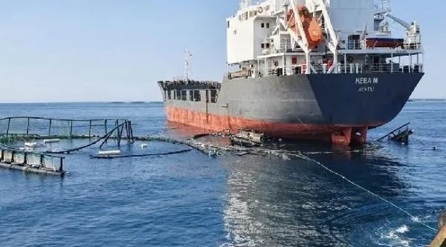 Muğla Güllük Körfezi'nde 139 metrelik kuru yük gemisi, balık çiftliğindeki havuzlara çarptı. 20 milyon TL'lik zarar olduğu bilgisi verildi.