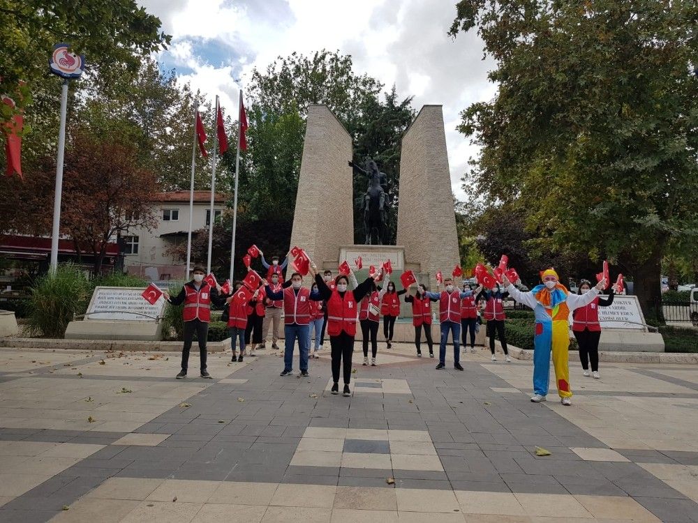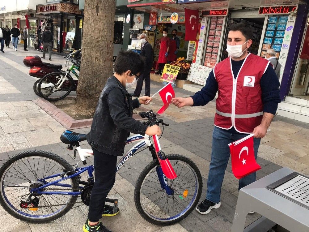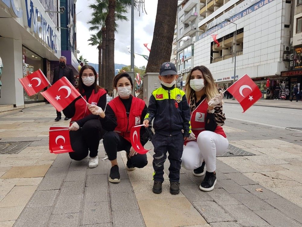 Genç Kızılay üyeleri, şehrin en işlek caddelerinde Cumhuriyet Bayramı nedeniyle özellikle çocuklara, vatandaşlara ve esnaflara 500 adet Türk bayrağı dağıttı