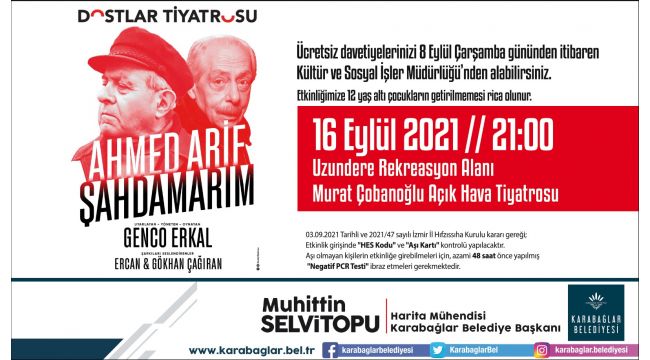 Dostlar Tiyatrosu, “Ahmed Arif-Şahdamarım” adlı oyunu, yarın akşam Karabağlar'da seyirciyle buluşturacak. Usta Sanatçı Genco Erkal'ın hem uyarlayıp yönettiği hem de sahnelediği oyunun, şarkılarını da Ercan ve Gökhan Çağıran seslendiriyor.