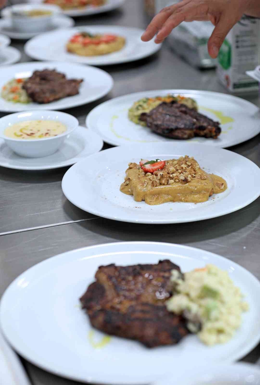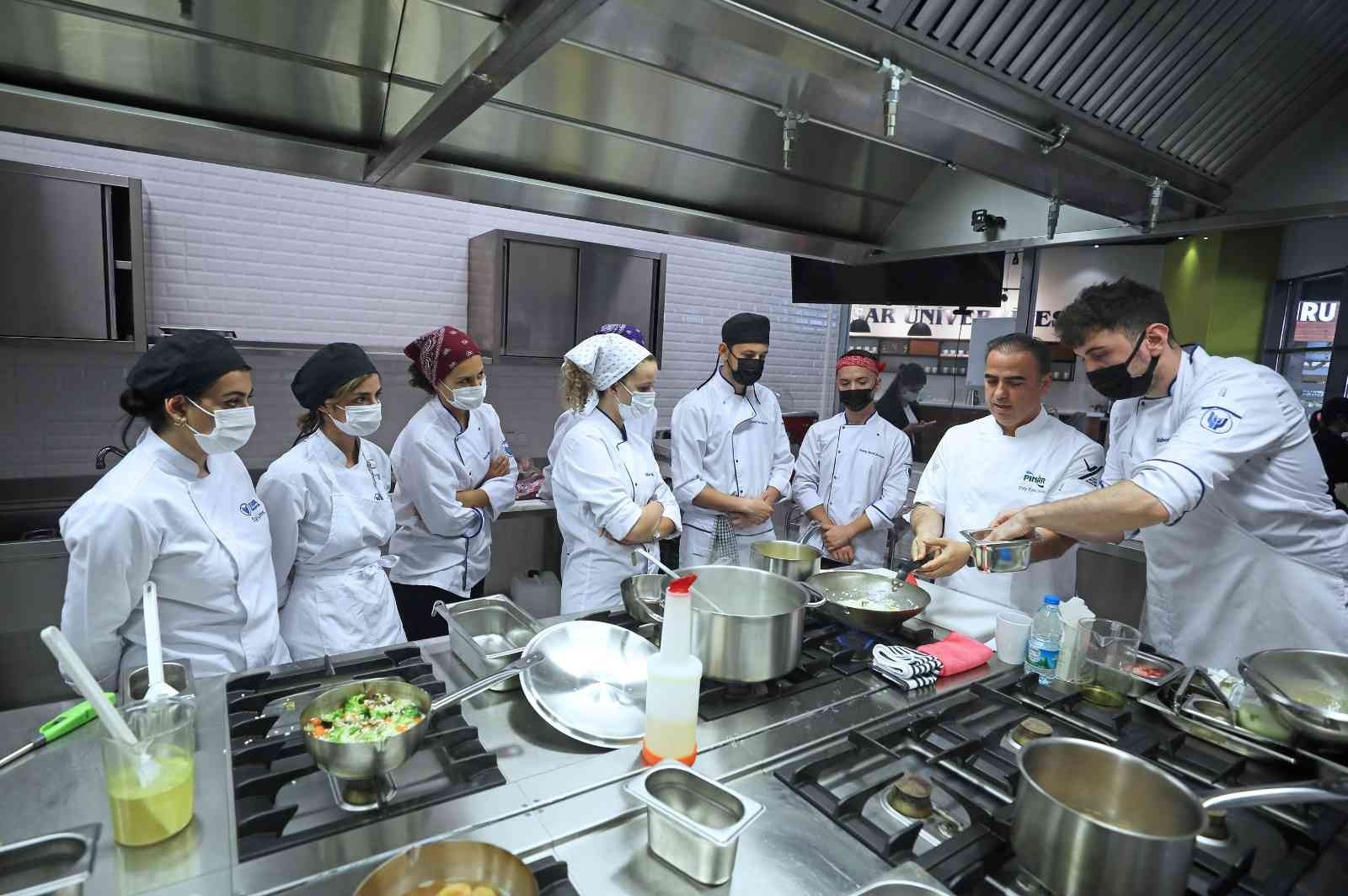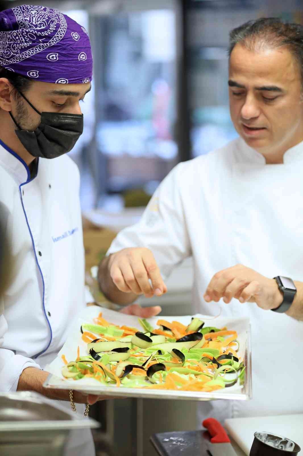 Şef Eyüp Kemal Sevinç, öğrencilere yemek yaparken ortaya çıkan atıkları nasıl değerlendirebileceklerini anlattı. Risottoda kullanılan patlıcan, brokoli ve kabağın kabukları, çöpe atılmak yerine fırında kurutulup öğütüldükten sonra içine baharat eklenerek sebze çeşnisi haline getirildi. Meyaneli tavuk çorbasında kullanılan yumurtaların kabukları ise fırınlandıktan sonra öğütülerek bayat ekmek dilimlerinin kullanıldığı kuru incir ve kayısı ezmesinden yapılan tatlı sosuna eklendi. Atölyenin sonunda yemekleri tamamlayan 3 grup, ortaya çıkan lezzetleri Gastronomi ve Mutfak Sanatları Bölümü personeline sundu.