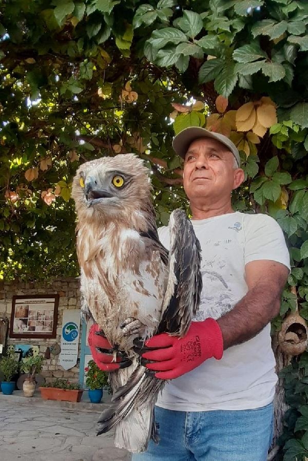 Kuşadası Dilek Yarımadası Milli Parkı'nın batı bölgesinde balık avından dönenler tarafından denizde bir kartal bulundu. Uçamadığı belirlenen kartal, Sevgi Plajı'ndaki tekne barınağına getirilip, durum EKODOSD yetkililerine bildirildi. EKODOSD Başkanı Bahattin Sürücü, ıslak, son derece bitkin ve aç olan yırtıcı kuşun, literatürdeki adı 'Circaetus gallicus' olan yılan kartalı olduğunu tespit etti.