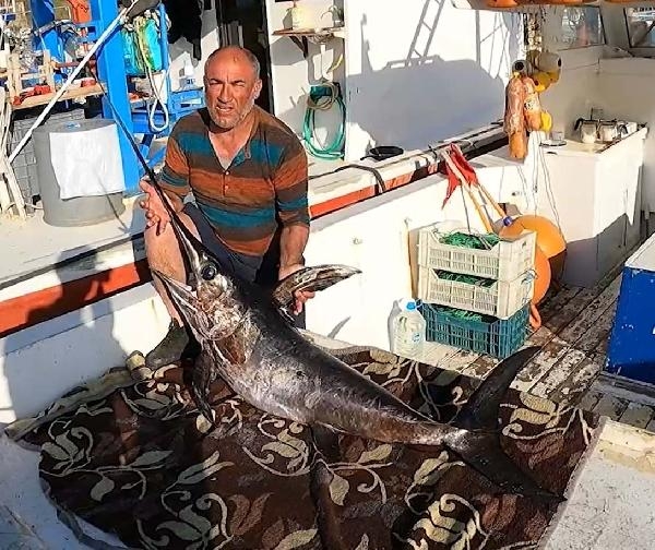 Gökçeada açıklarında Zürafa Kayalıkları yakınında 'Aydın Efe' isimli teknesiyle avlanırken, tacize uğradığı Yunanistan Sahil Güvenlik unsurlarına direnmesiyle tanınan balıkçı İlker Özdemir, bu kez yaklaşık 50 kilogram ağırlığında kılıç balığını yakaladı. Kaleköy balıkçı barınağından teknesiyle kılıç balığı avına çıkan Özdemir'i seyir halindeyken yunuslar da bir süre takip etti. Özdemir, daha sonra karşısına çıkan kılıç balığını, 4 metre uzunluğundaki gönderin ucuna bağlı olan zıpkın ile avladı. Özdemir, "Bir anda önüme çıktı balık. Vurduktan sonra yaklaşık 250 metre derine indi ama 1,5 saatlik mücadeleyi biz kazandık" dedi. (DHA)