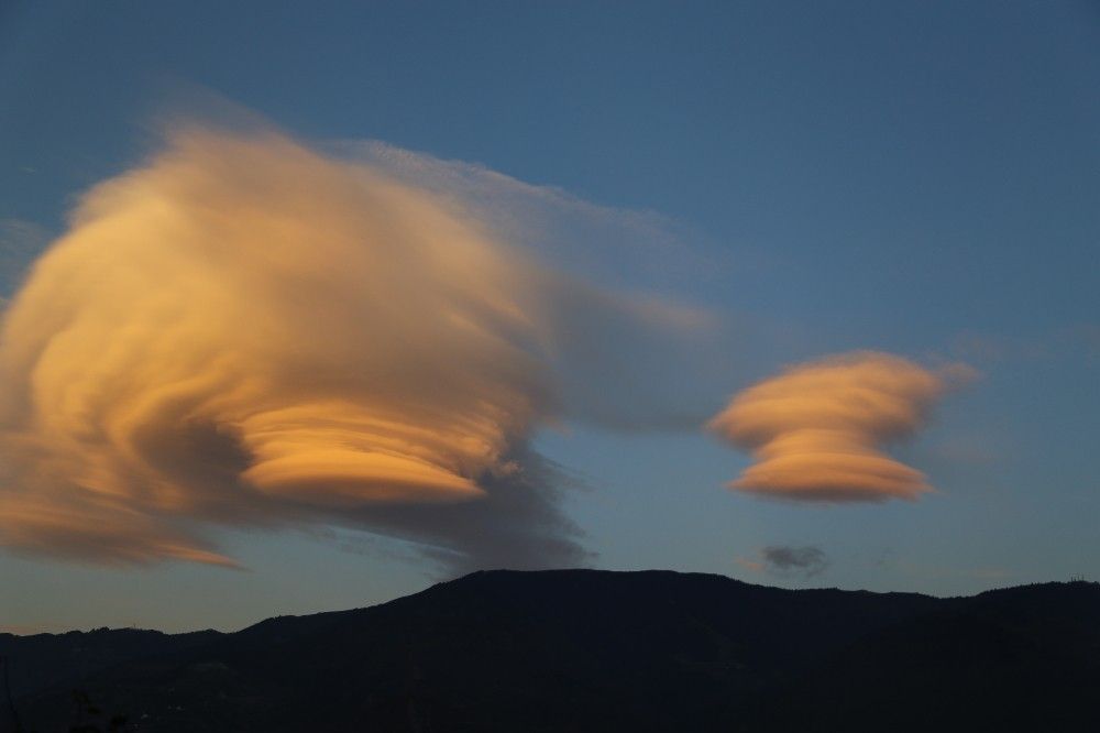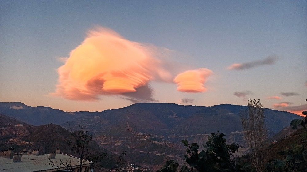 Lenticular (merceksi) bulutlar kümesi olarak bilinen bulutların ilginç görüntüsü Artvin'de objektiflere yansıdı. Akşam saatlerinde il merkezinde, şehrin hemen üzerinde oluşan bulutları gören pek çok kişi görüntüledikleri bulutları sosyal medya hesabında paylaştılar.