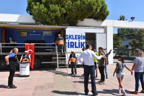 İZMİR Fuar alanına kurulan AFAD'a ait simülasyon TIR'ına giren vatandaşlar; 1999 yılında gerçekleşen 7.4 büyüklüğündeki Gölcük depremi ile 1939 yılında gerçekleşen 7.9 büyüklüğündeki Erzincan depremini deneyimledi.