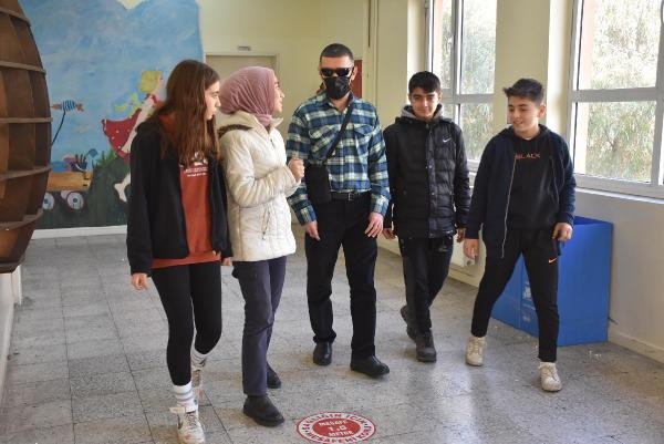 İZMİR'in Gaziemir ilçesindeki Aslanlar Ortaokulu'nda görev yapan görme engelli Ayhan Özgür (37), "Gözüm görseydi yine sosyal bilimler öğretmeni olurdum. Çok severek yapıyorum. Başarıyı isteyen öğrencilerim de yeter ki çalışsınlar. Gören görmeyen fark etmez, hedefine kilitlenen amacına ulaşır" dedi.