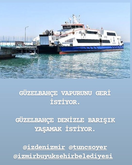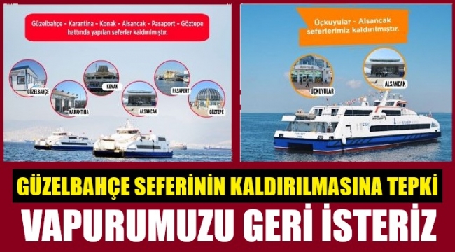 İzmir'de Güzelbahçe'ye yapılan vapur seferlerinin kaldırılması, ilçe halkının tepkisine yol açtı. Vatandaşlar vapurlarının geri verilmesi için hem ilçe belediyesi, hem de Büyükşehir belediyesinden yardım istedi. İzdeniz şirketinin yanlıştan geri dönmesini istedi.