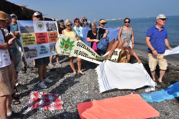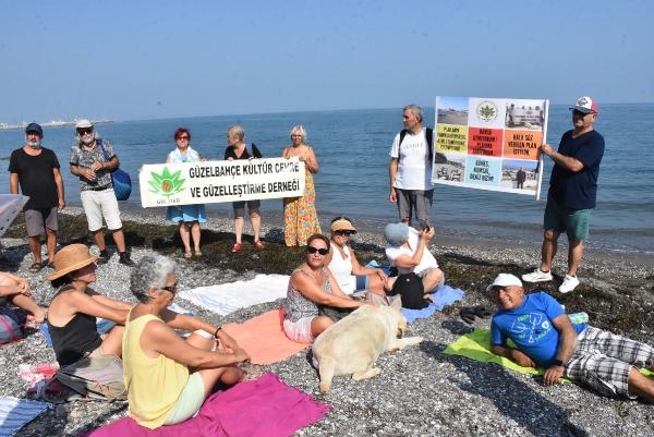 İZMİR'in Güzelbahçe ilçesindeki sahil şeridinde kafe ve restoranlara ait platformlar ile masa sandalyelerin halkın denize girmesini engellediğini savunan Güzelbahçe Kültür Çevre ve Güzelleştirme Derneği üyeleri, 'Havlunu Kap Gel' eylemi yaptı.