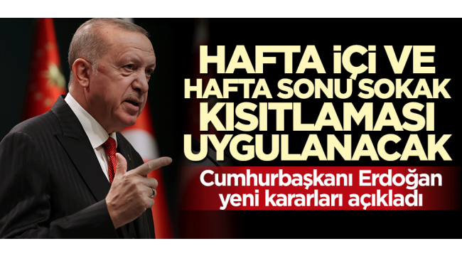 Kritik Kabine Toplantısı sonrası Cumhurbaşkanı Erdoğan son dakika açıklamalarında bulundu. Erdoğan, hafta içi her gün 21.00 ile 05.00 saatleri arasında genel sokağa çıkma yasağı uygulanacağını duyurdu. Erdoğan, yasağın Cuma akşamı 21:00’den Pazartesi sabahı saat 05:00’e kadar kesintisiz devam edeceğini belirtti.