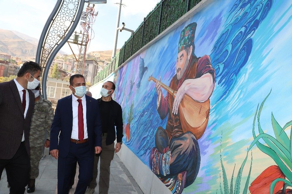 Hakkari Valisi ve Belediye Başkan Vekili İdris Akbıyık, Belediye Başkan Yardımcısı Hamit Zibek de istinat duvarına çizilen resimleri yakından incelediler. Vali Akbıyık, istinat davarlarını yörenin doğal güzellikleri ile süslemeye devam edeceklerini söyledi.