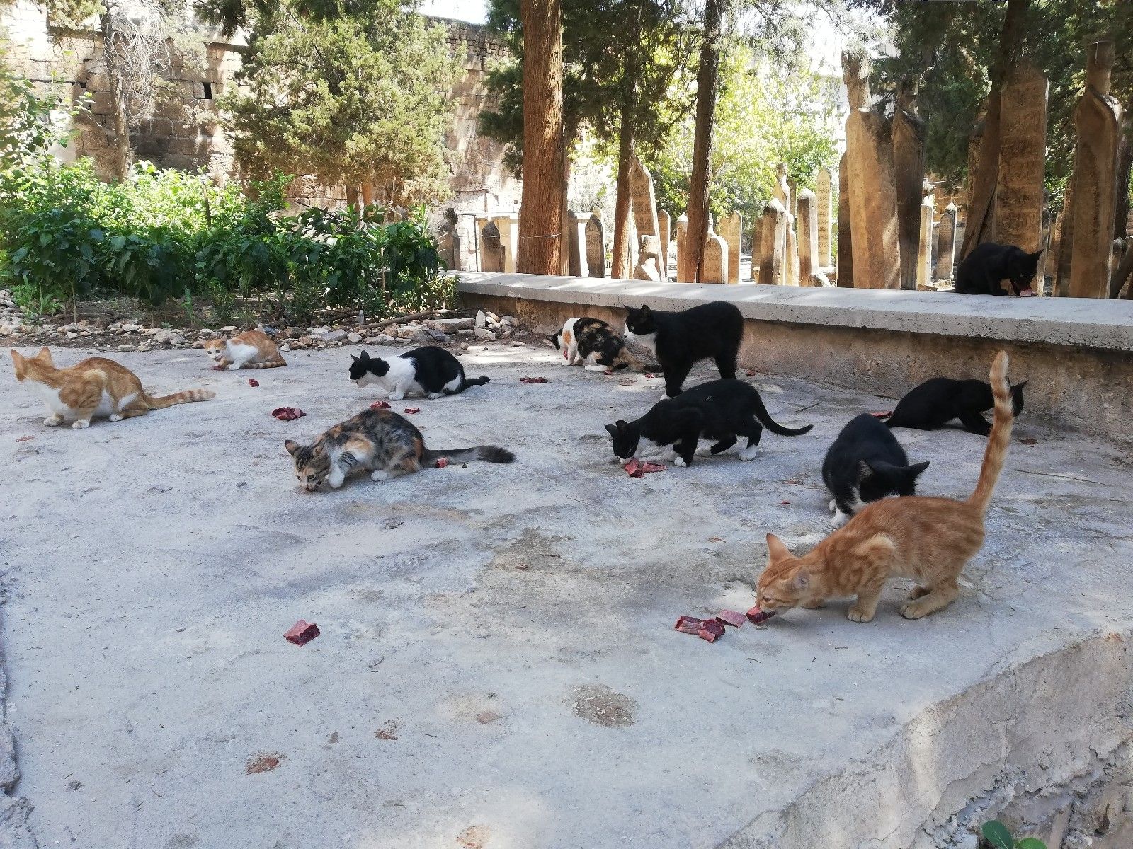 Bahri Adaklı'nın sesini duyup gelen kediler, ciğerleri yedikten sonra tekrar dağılıyor.