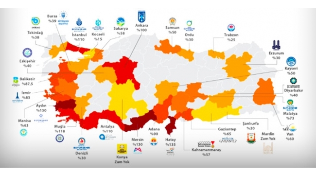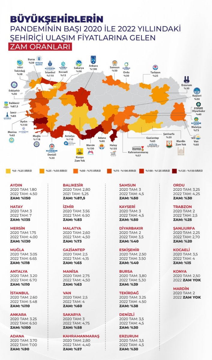 Örneğin yüzde 150 zamla vatandaşı mağdur eden Aydın Büyükşehir Belediyesi Türkiye lideri oldu. İzmir'de zam yüzde 83 oldu. Konya Büyükşehir Belediyesi ise, bu zamlardan geri kaldı. Başkan Uğur İbrahim Altay, Konya’da öğrencilerin ulaşım ücretlerine 4 yıldır, sivil ulaşım ücretlerine ise 2 yıldır zam yapmadıklarını söyledi.