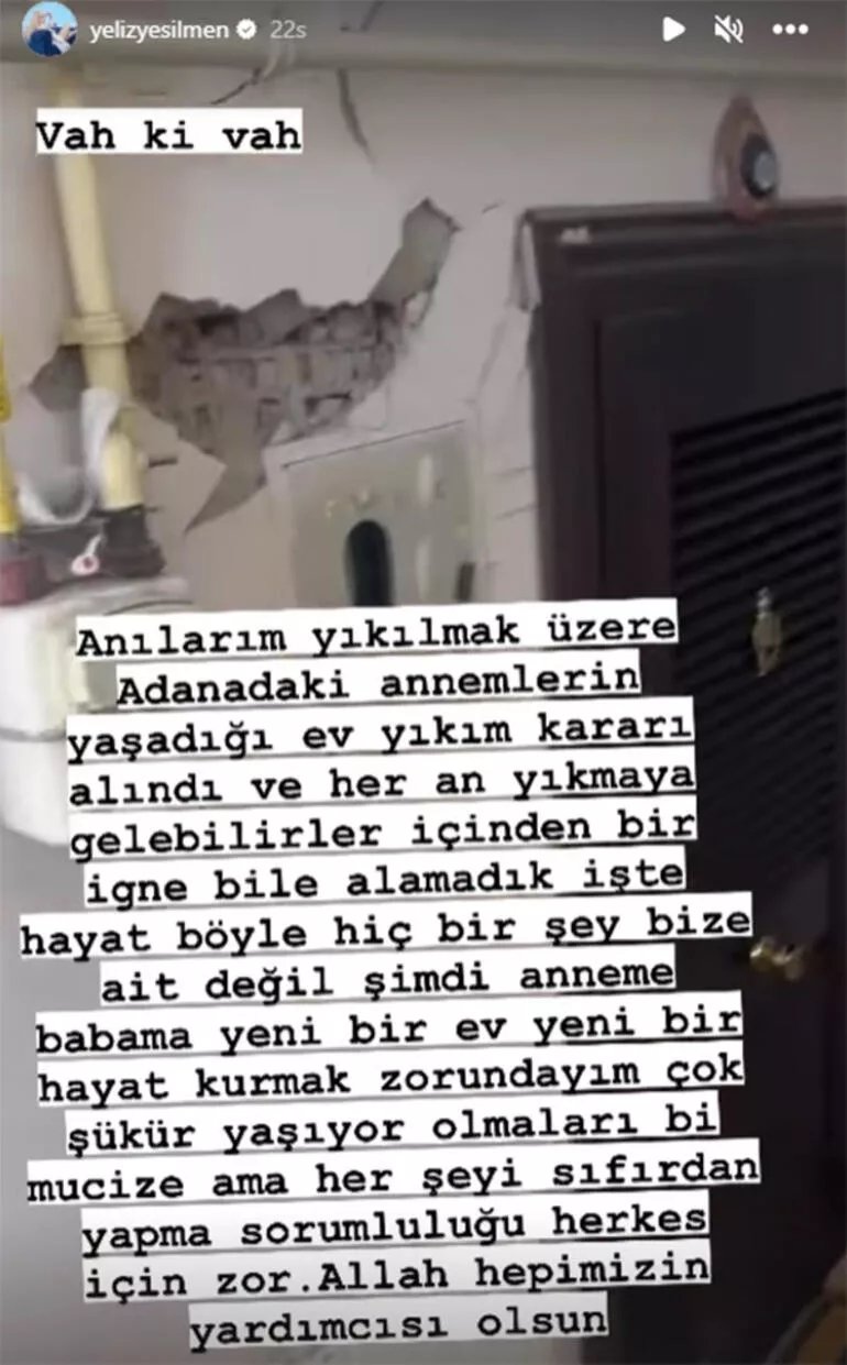 Depremin ilk gününden beri üzüntüsünü dile getiren Yeliz Yeşilmen'in ailesi de depreme yakalandı. Ailesi Adana'da yaşayan Yeliz Yeşilmen anne ve babasına sağ salim kavuşurken, çocukluğunun geçtiği ev için yıkılma kararı alındığını sosyal medya hesabından paylaştı.