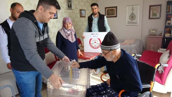 AYDIN'da engelli, yatalak ve oy kullanmaya gidemeyecek kadar hasta olan 8 kişi, evlerine gelen seyyar sandıkta oylarını kullandı. 200 kilo olduğu için yürümekte güçlük çeken Aysel Dönmez (53), sandığın eve gelmesine en çok sevindiğini söyledi.