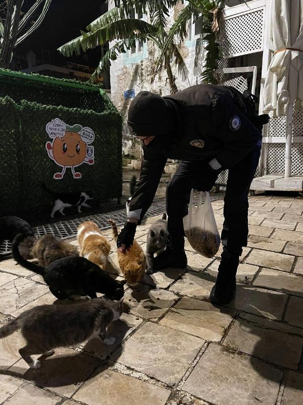 MUĞLA'nın Bodrum ilçesinde, havaların soğuması nedeniyle sokakta kalan vatandaşlar polis ekiplerince otellere yerleştirildi. Öte yandan yiyecek bulmakta zorlanan sokak hayvanları da polis ekipleri tarafından beslendi.
