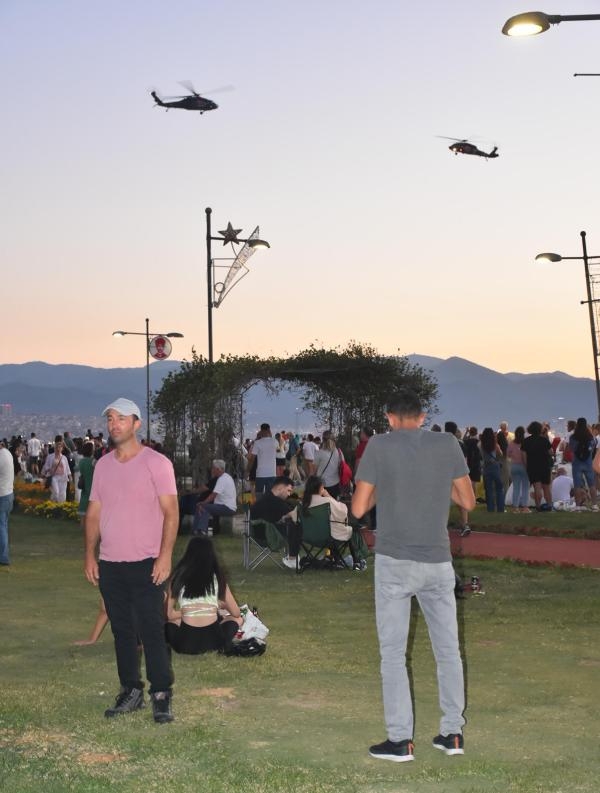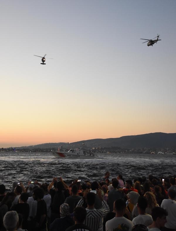 AYJET gösteri uçuşunun ardından Türk kadın profesyonel akrobasi pilotu Semin Öztürk Şener akrobasi uçuşu gerçekleştirdi. Şener izleyenlerden büyük alkış aldı. Daha sonra İzmir Airshow havacılık gösterileri kapsamında Avrupa Sivil Havacılık Otoritesi'nden 'tip sertifikası' alan ilk Türk uçağı Hürkuş havalandı. T-6 Texan Akrobasi uçuşu ve Polis Havacılık Üzüm Salkımı uçuşunun ardından flyboard gösterisi gerçekleştirildi. Gösterinin en ilgi çeken kısmı ise SoloTürk gösteri uçuşu oldu. Gösteride üç F-16, üç F-4, üç de F-38 selamlama uçuşu yaptı. SoloTürk'ün akrobasi hareketleri büyük alkış aldı. Türk Hava Kuvvetleri akrobasi timi SoloTürk'ün gösteri uçuşu yaklaşık 20 dakika sürdü. Kordon boyunda toplanan vatandaşlar ve balkonlarından uçuşu izleyenler gösteriyi cep telefonu kamerasıyla kayda aldı. SoloTürk'ün ardından son olarak ABD savaş uçağı Mustang gemilerin arasından geçerek kıyıya sorti yaptı.