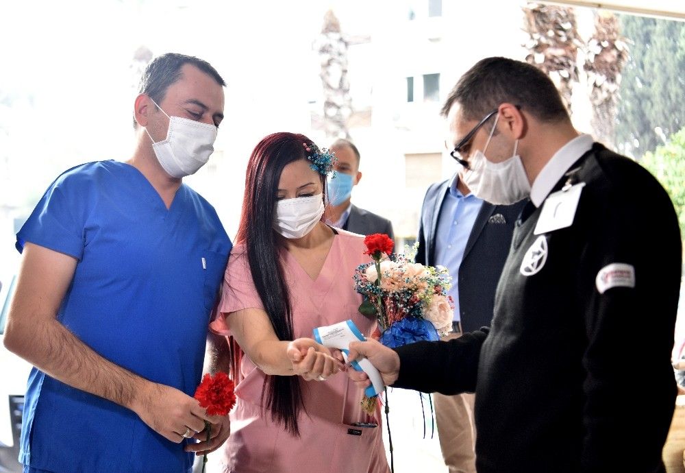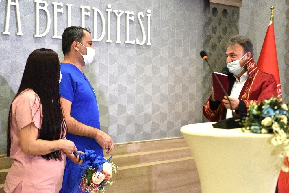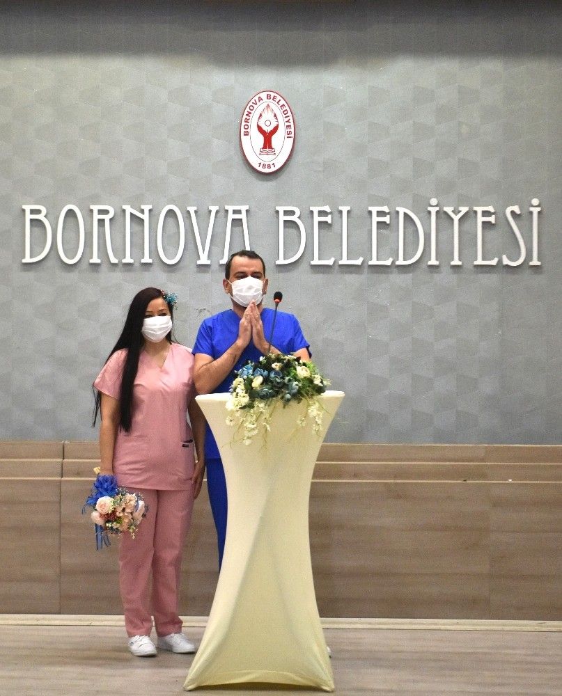 Ege Üniversitesi Tıp Fakültesi Hastanesi'nde görevli hemşire Zeynep Fırtına (48) ve Bornova Ağız ve Diş Sağlığı Merkezi'nde görevli diş doktoru Erhan Yaymacı (44), korona virüs sürecinde yoğun bakım servislerinde görev almaya başladı. Zorlu pandemi sürecinde aile büyükleriyle bile görüşemeyen çift, evlenme kararı aldı ancak pandemi nedeniyle aileler tanışamadı. Nikah için gün alan çift, bugün Bornova Belediyesi Nikah Salonu'nda kıyılan nikah ile dünya evine girdi. Çiftin gelin arabası ise çiçeklerle süslenen ambulans oldu. Belediyeye ait nikah salonuna siren sesleri eşliğinde ambulansla gelen çift, alkışlarla içeriye alındı. Çiftin nikahı ise maske ve mesafe kuralları doğrultusunda Bornova Belediye Başkanı Mustafa İduğ tarafından kıyıldı.