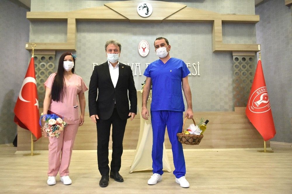 Çiftin nikahını kıyan Bornova Belediye Başkanı Mustafa İduğ ise, "Bornova'da ikamet eden tüm sağlık çalışanlarının nikah işlemleri ve 'Her şey bizden' projesi devam ediyor. Onlar bizim yanımızda, biz de onların yanındayız. Bu mutlu günlerinde onların nikahını kıymaktan dolayı mutluyum. Çok zor bir dönem geçirdik. Kaybedilmiş 1 yıl oldu. Böyle bir mutlu günü özlemişiz. İnşallah 2020 yılında daha mutlu bir dünya temenni ediyorum. Tüm sağlık çalışanlarının fedakar çalışmalarından müteşekkirim" diye konuştu.