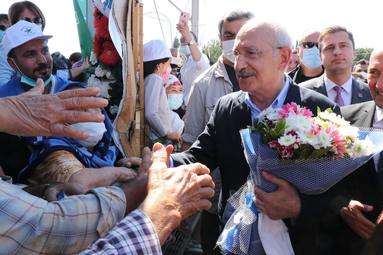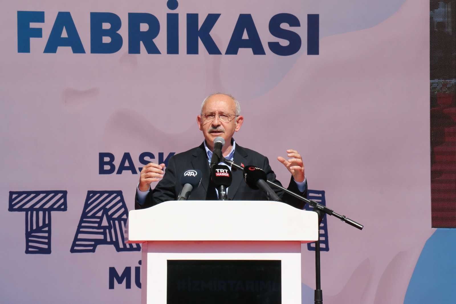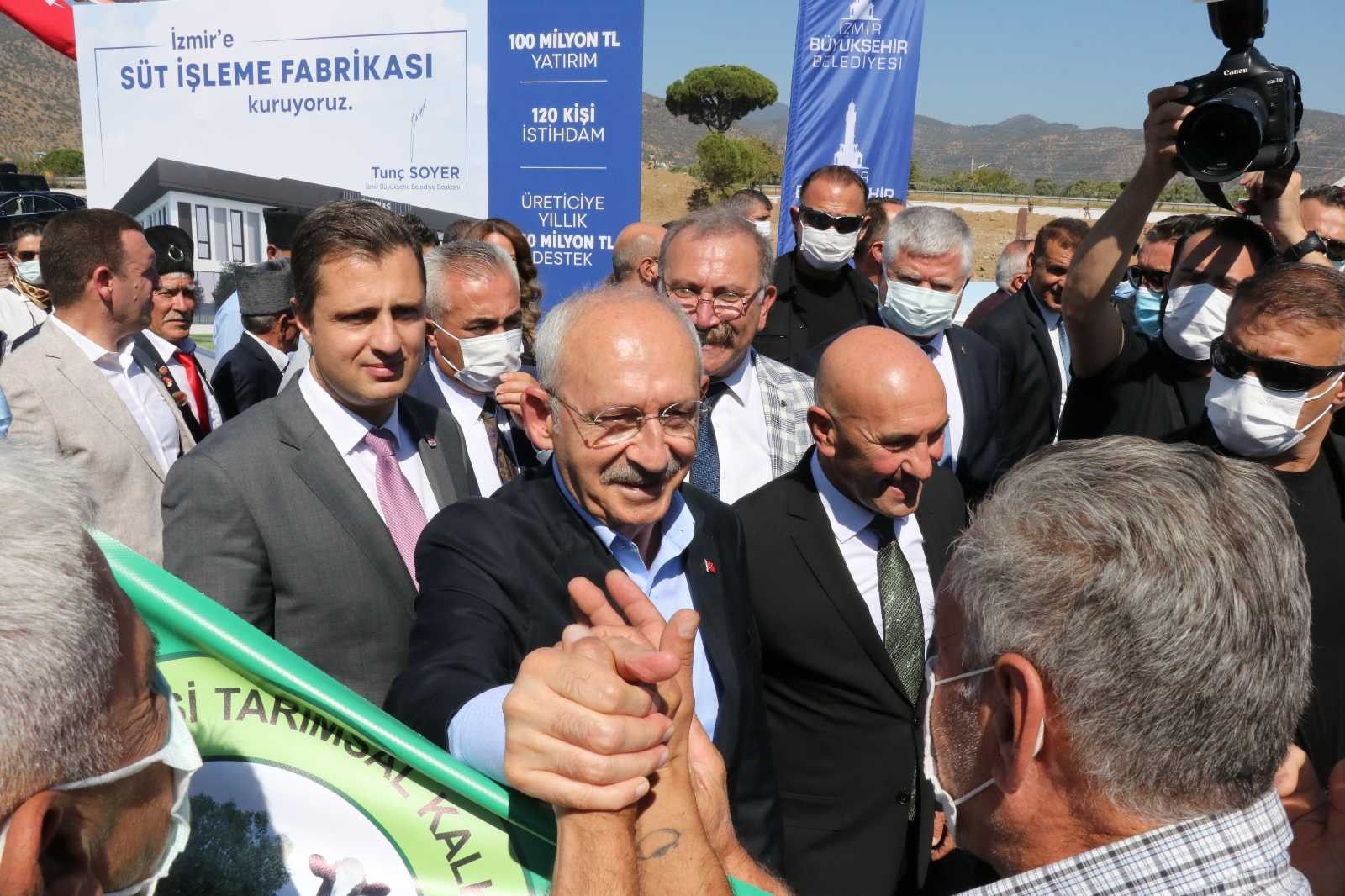 Törende Başkan Soyer'in ardından kürsüye gelerek konuşma yapan Kılıçdaroğlu, iktidarın tarım politikasını eleştirdi. CHP lideri Kılıçdaroğlu, "Çok güzel bir fabrikanın temelini atıyoruz. Üretmek kadar değerli bir şey yoktur. Üretmek alın teri, kazanmak, bir kentin sokaklarında onuruyla gezmek, el aleme muhtaç olmamak ve Türkiye'nin büyümesi demektir. Türkiye'nin dünyada söz sahibi olması demektir. Bize diyorlar ki 'Niye toprağı ekiyorsunuz? Un mu lazım, buğday mı lazım, yem mi lazım, et mi lazım? Biz verelim. Bizim çiftçimiz kazansın.' Kazanmasın. Bizim çiftçimiz ne olacak? Bu kaderi değiştireceğiz. Çiftçi milletin efendisi derler, biz efendiliği bırakmadık. Her şey dışarıdan geliyor. Çiftçinin durumu iyi diyorlar sen saraydan bakarsan çiftçinin durumunu göremezsin. Elin oğlu kazanıyor. Bizim çiftçimiz neden kazanmıyor? Biz yeni bir stratejiyi hayata geçirmeye çalışıyoruz. İktidar değiliz ama sizin oylarınızla olacağız. Bütün belediye başkanlarımız siz kazanırsanız diye çalışıyorlar. Bizim amacımız sizin hayat standardınızı yükseltmek. Bir ülke üretirse güçlü olur. Konya'dan küçük Hollanda yılda 180 küsur milyar dolar tarım ürünü ihraç eder. Bizim ihracatımız 18-20 milyar dolar. Neden? Toprak, çiftçi, güneş var. Neyimiz eksik? Yanlış siyasetimiz var. Siyasetimiz eksik. Üreticiye destek verdiğiniz sürece kazanmanız mümkün. Bir bakan düşünün. Çiftçiyi şöyle tanımlıyor: Çiftçi çok çalışır az kazanır. Böyle bir tanım mı olur? Niye az kazansın? Daha fazla kazanması lazım. Çiftçinin traktörüne devri iktidarımızda hiçbir güç haciz uygulayamayacak. Adamı perişan etmişsiziniz, borç batağına sokmuşsunuz Geliyorsunuz traktörünü alıyorsunuz, açlığa mahkum ediyorsunuz. Haram yiyenin burnundan fitil fitil getireceğim. Sizin bankalardan aldığınız kredilerin faizlerini ilk bir haftada sileceğim. Ana parayı da makul taksitlerle alacağız" diye konuştu.