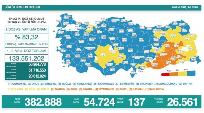 Türkiye'de son 24 saatte 382 bin 888 Kovid-19 testi yapıldı, 54 bin 724 kişinin testi pozitif çıktı, 137 kişi yaşamını yitirdi.