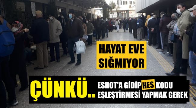 İzmir Büyükşehir Belediyesi toplu ulaşımda Hayat Eve Sığar (HES) kodu zorunluluğu getirdi. Toplu ulaşımda kullanılan Kentkart'a HES kodu eşleştirmesi için verilen süre bu hafta doluyor. Bu nedenle ESHOT bürosu önünde uzun kuyruklar oluştu.