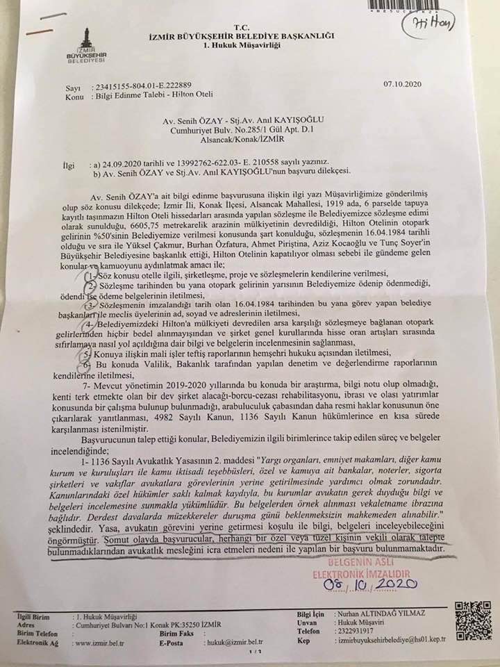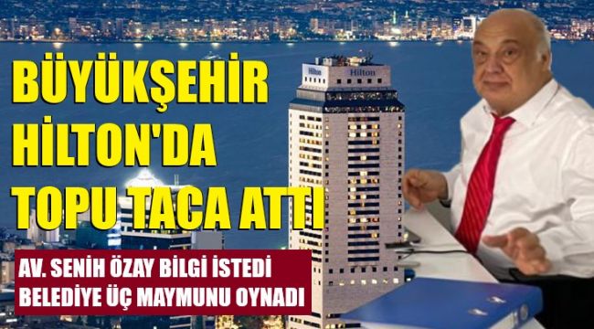 Hilton Oteli binasıyla ilgili İzmirli'nin hakkını aramak için harekete geçen avukat Senih Özay, otelin ortağı olan İzmir Büyükşehir Belediyesi'nden geçen ay bilgi istedi. Belediye Özay'a cevap gönderdi ama hiç bir sorunun karşılığı yoktu.