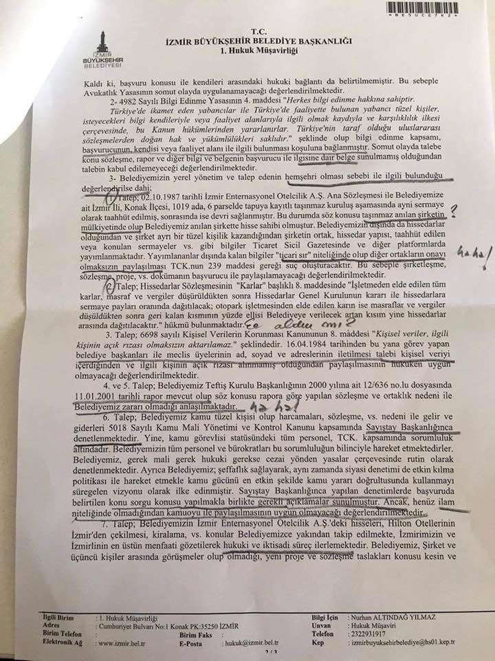35 katlı Hilton Oteli'ndeki İzmir Büyükşehir Belediyesi alacakları ile ilgili mücadele başlatan avukat Senih Özay, istediği bilgiler için belediyeden gönderilen yazıyı görünce tepki gösterdi. Çünkü cevabi yazıda İzmir Büyükşehir Belediyesi hukukçuları hiç bir bilgi vermedi, vermenin sakıncalı olduğunu belirtti. Konuyu Amerika İnsan Hakları Mahkemesi’ne taşıyacağını belirten Avukat Özay, şu açıklamayı yaptı: