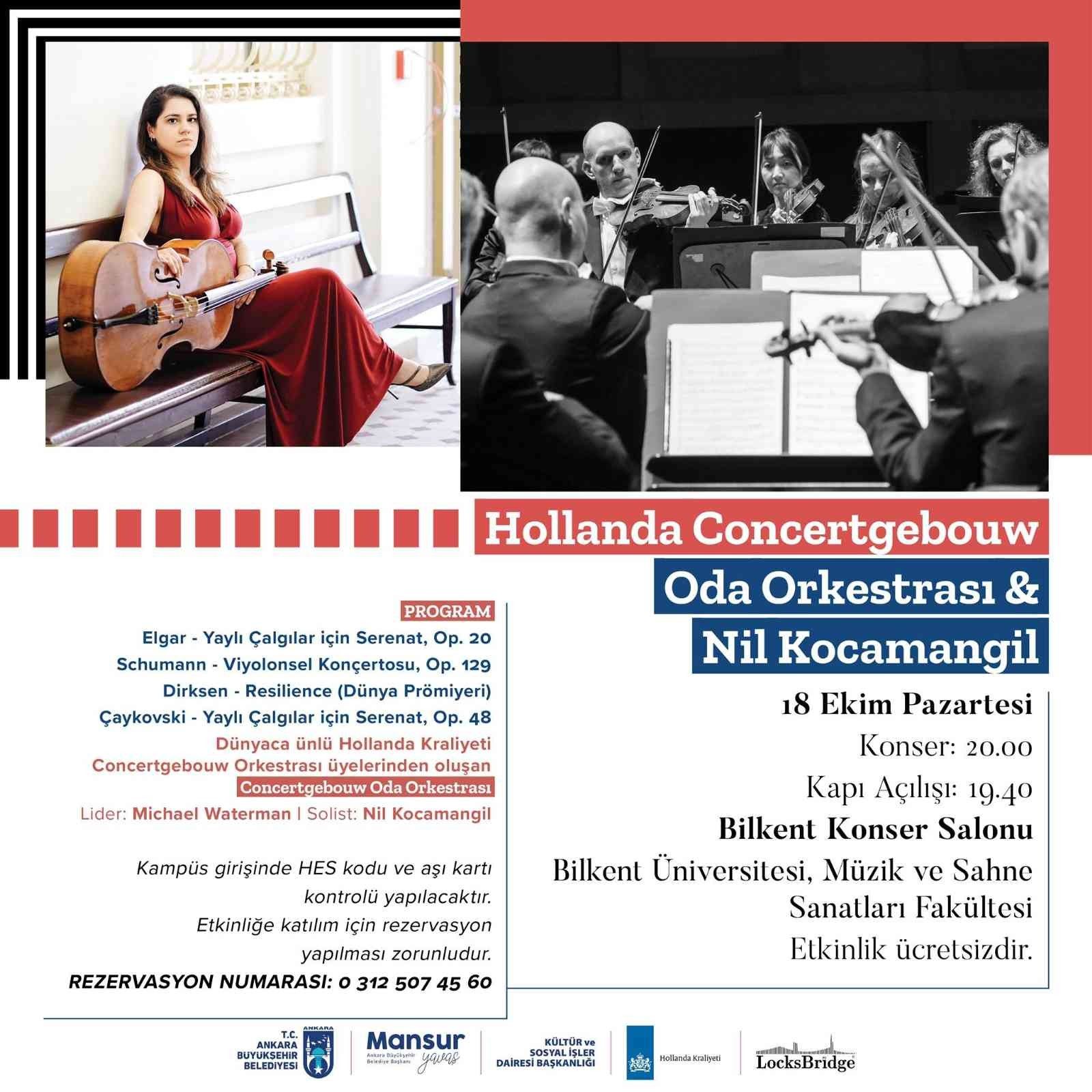 Ankara Büyükşehir Belediyesi, başkentli sanatseverleri Hollanda'nın en prestijli orkestralarından olan Hollanda Kraliyet Concertgebouw Orkestrası üyelerinden oluşan "Concertgebouw Oda Orkestrası" ile buluşturacak. Büyükşehir Belediyesinin ana sponsorluğunda Hollanda Büyükelçiliği'nin katkılarıyla Bilkent Konser Salonu'nda 18 Ekim tarihinde düzenlenecek konserde orkestraya ilk kez ödüllü Türk çellist Nil Kocamangil de eşlik edecek. Boğaziçili kültürel girişimcilerden Duygu Esenkar ve Onur Tahmaz tarafından kurulan LocksBridge'in menajerliğini üstlendiği Concertgebouw Oda Orkestrası'nın vereceği ilk konser tüm sanatseverlere ücretsiz olacak. Dünyaca ünlü orkestra, Türkiye turnesine Ankara'dan başlayacak. Rob Dirksen'in "Resilience" isimli eserinin de dünya prömiyeri ile yer alacağı konser, 18 Ekim Pazartesi günü saat 20.00'de Bilkent Üniversitesi Müzik ve Sahne Sanatları Fakültesi Bilkent Konser Salonu'nda yapılacak. Konserde pandemi önlemleri uygulanacak.