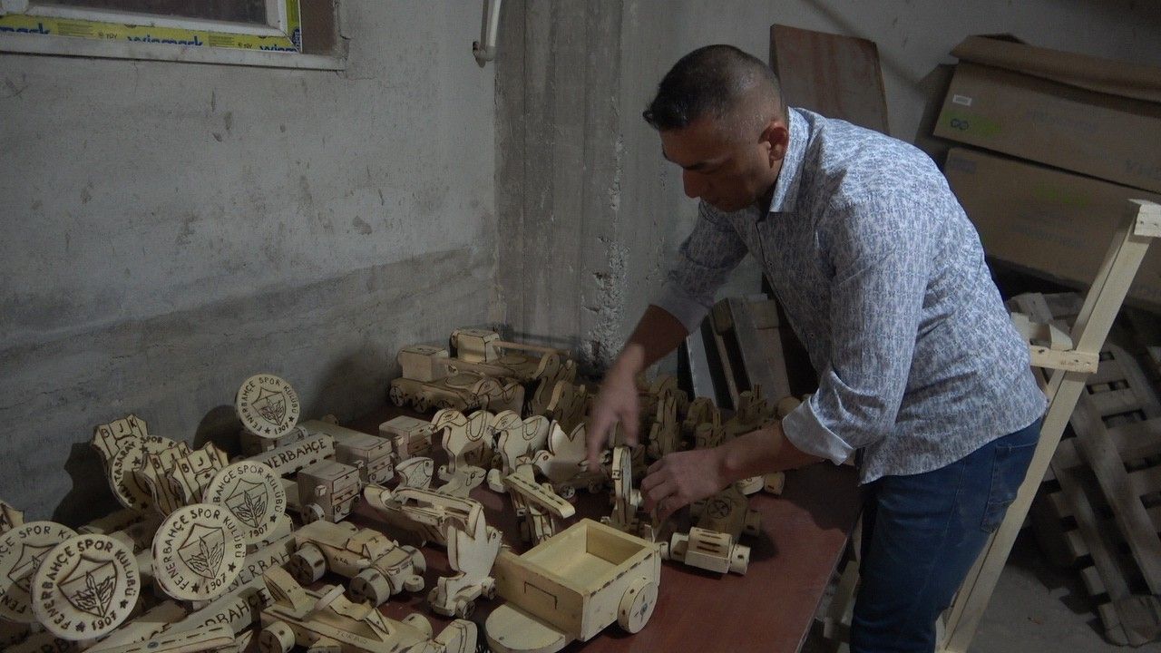 Denizli'de 42 yaşındaki tekstil işçisi Veli Bat, kullanılmış hurda tahta paletlerden çocuklar için doğal oyuncak yapıyor.
