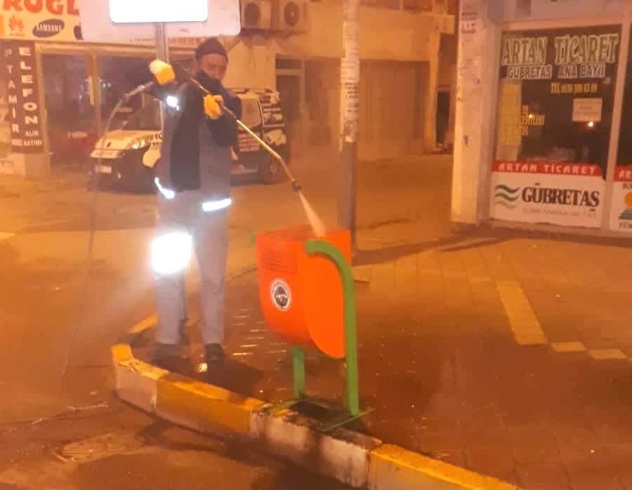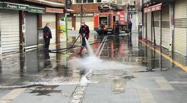 Yapılan yazılı açıklamada, "Hafta sonu yurt genelindeki sokağa çıkma kısıtlamasını fırsata çeviren İtfaiye Müdürlüğü ekiplerimiz, boş kalan cadde ve sokaklarımızda sabunlu suyla yıkama ve dezenfekte çalışmasını titizlikle yürütüyor. Sokağa çıkma kısıtlamasını fırsat bilen ekiplerimizin çok yönlü temizlik çalışması devam ediyor. Cadde ve sokaklardaki kapsamlı yıkama ve süpürme işlemlerinden sonra şimdi de asma çöp kutularını baştan aşağı dezenfekte ediyoruz. Sizler evinizde, bizler işimizin başındayız" denildi.
