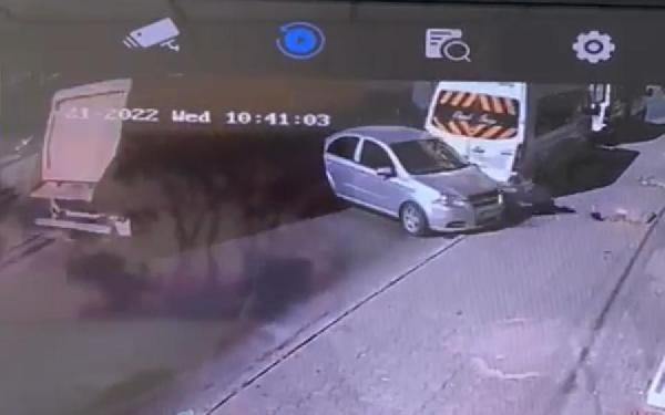 İZMİR'in Bornova ilçesinde servis sürücüsü A.B., aracının arka kısmında bulunduğu sırada kontrolden çıkan bir otomobilin çarpması sonucu iki araç arasında sıkışarak yaralandı. O anlar, güvenlik kameraları tarafından kaydedildi.