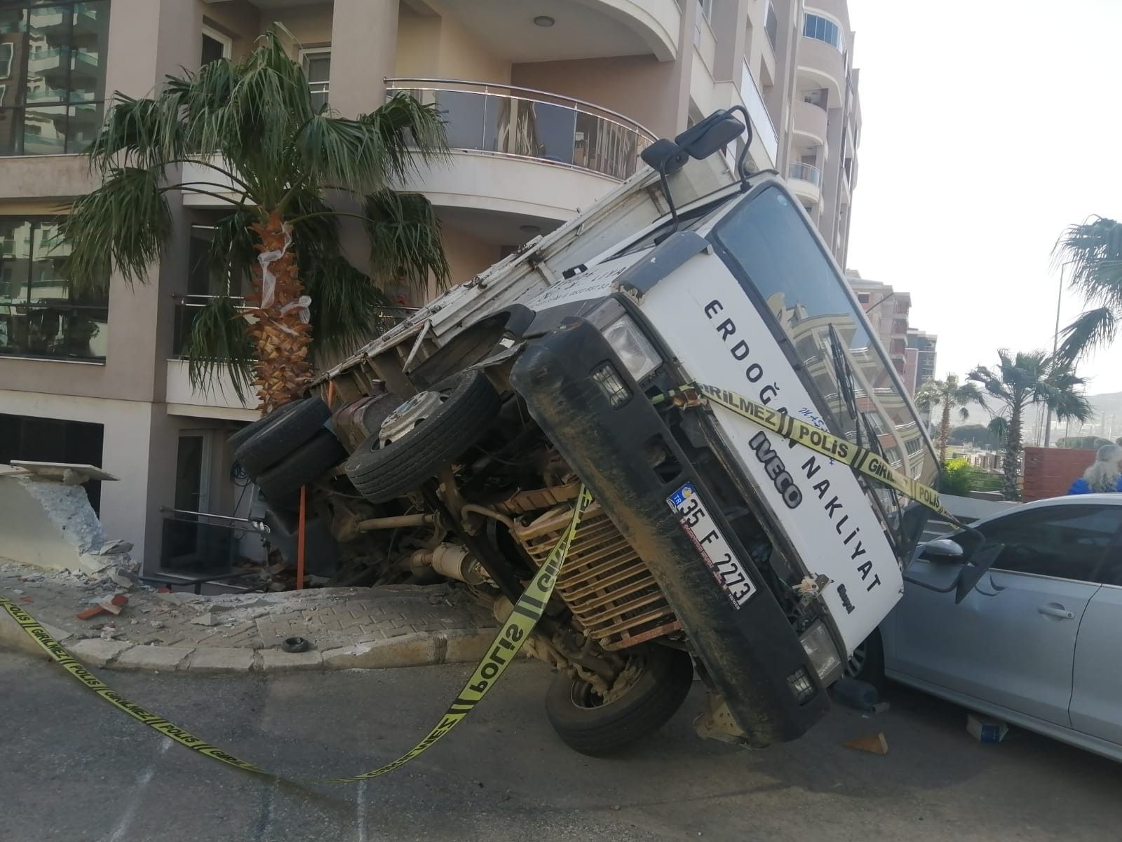 Kaza, Aliağa ilçesi Siteler Mahallesi'nde meydana geldi. Edinilen bilgiye göre, E.Y. (35) idaresindeki 35 F 2273 plakalı parke taşı yüklü kamyon durakladığı esnada freni boşaldı. Bu sırada direksiyondaki kamyon sürücüsü ne yaptıysa aracı durduramadı. Hızla giden kamyon, 2 araca çarptı, ardından bir binanın istinat duvarını yıktı. Kamyon, ardından da yan yatarak asılı kaldı. Meydana gelen feci kazada faciadan dönülürken, kamyon sürücüsü Erkan Y. kazayı hafif sıyrıklarla atlattı.